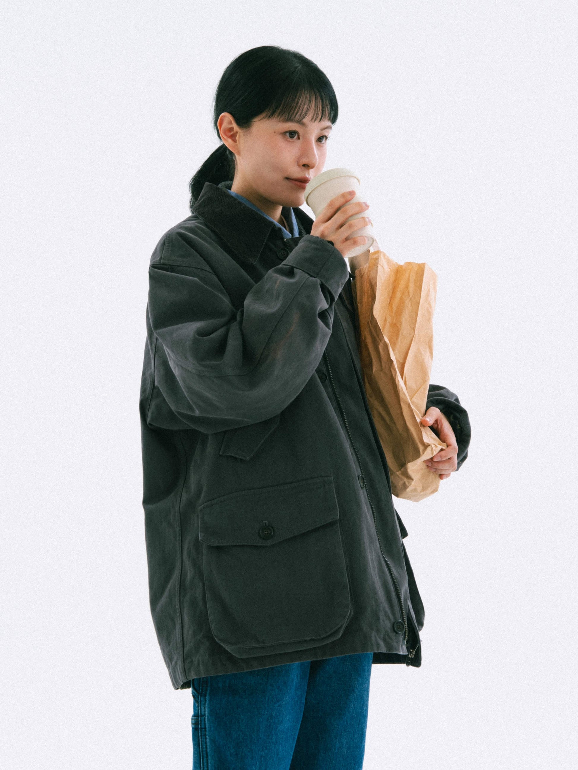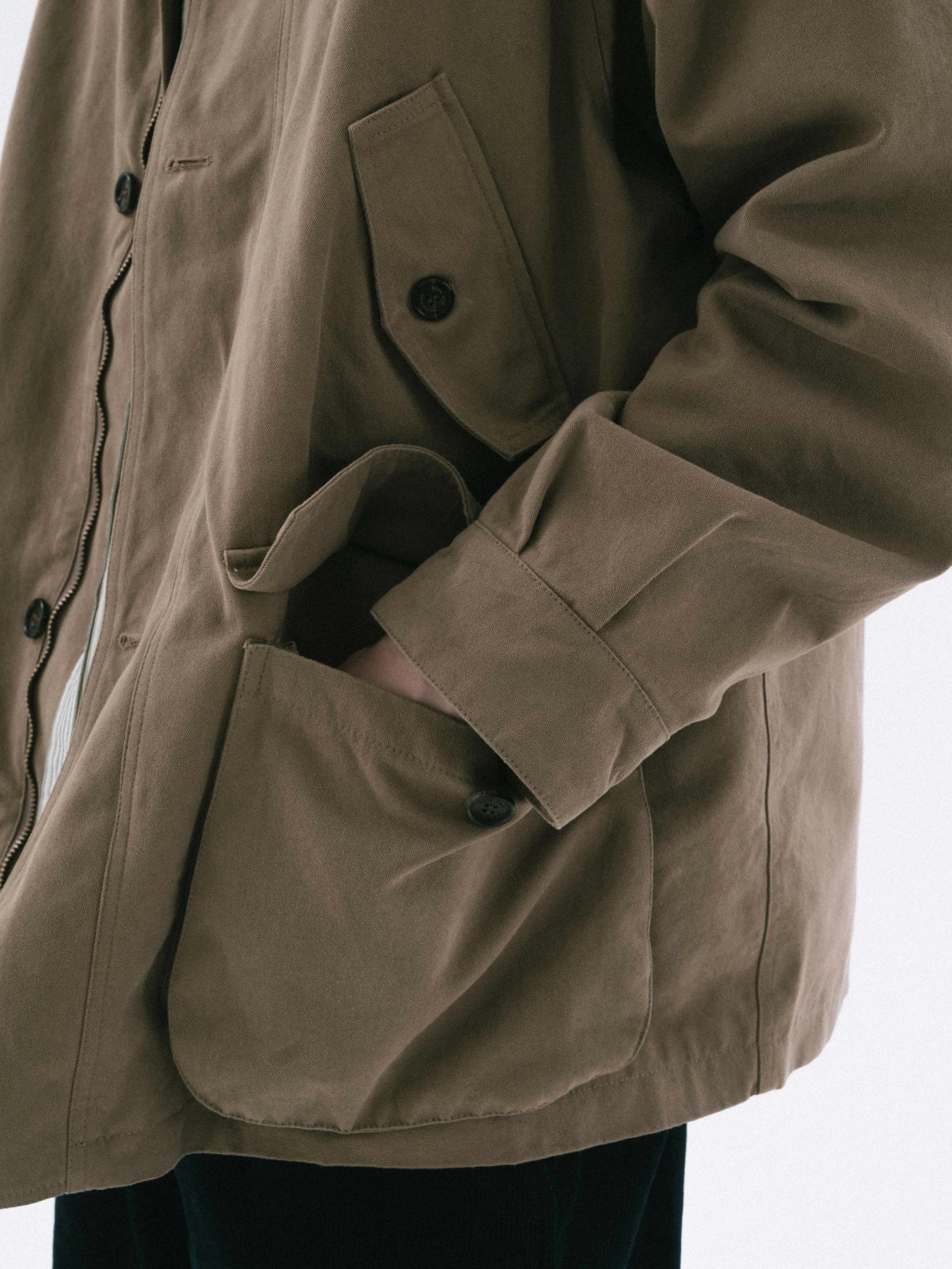 This heavy outerwear, based on the traditional field jacket, features Havehad's balanced silhouette and details. It uses sturdy 10-count canvas fabric, ensuring a stable form. The detachable 4-ounce quilted lining allows versatile wear across seasons. Wear it alone during transitional weather or layer with the lining in the dead of winter for added warmth. The subtly washed texture and toned-down colors harmonize with the season.