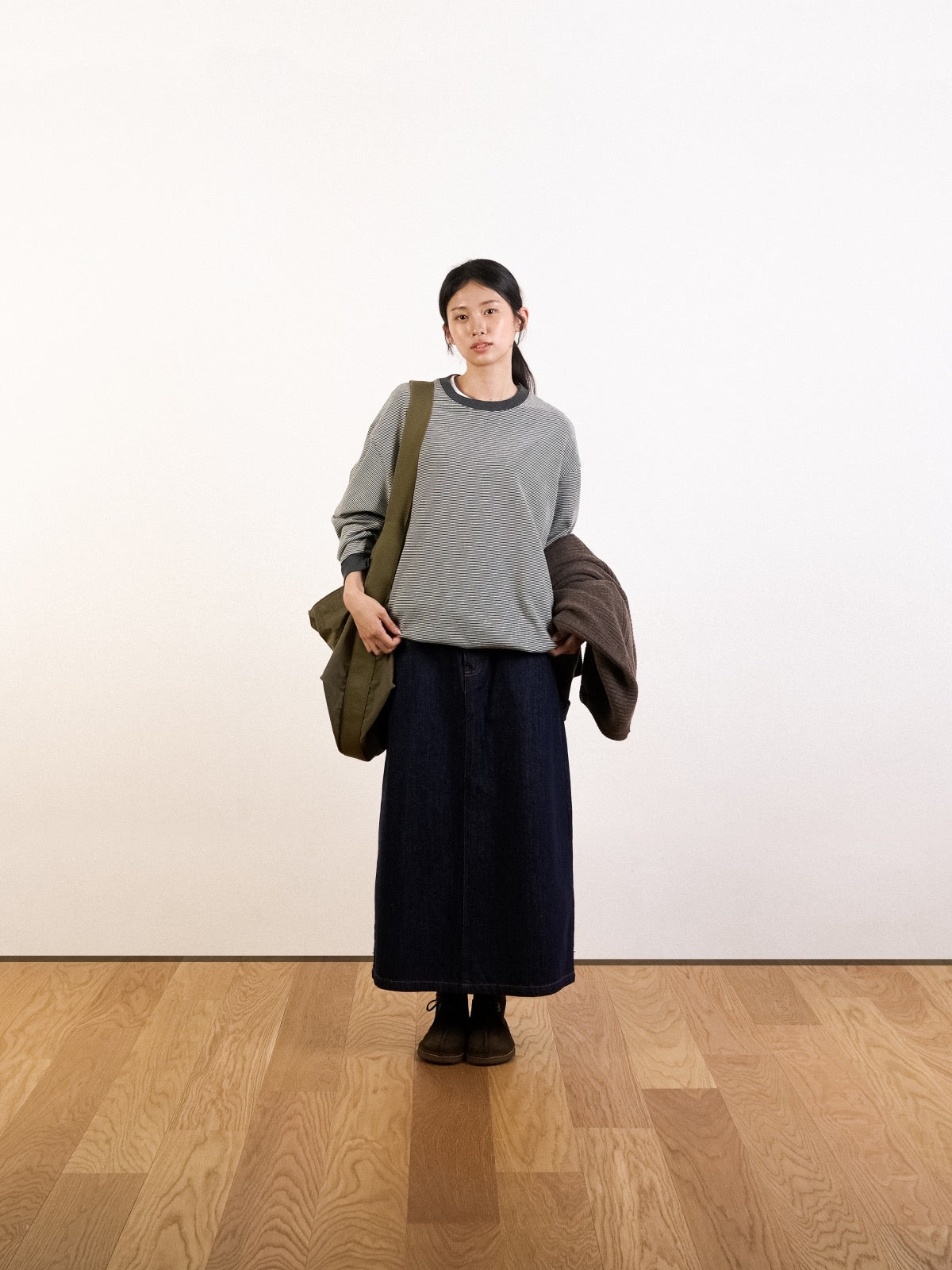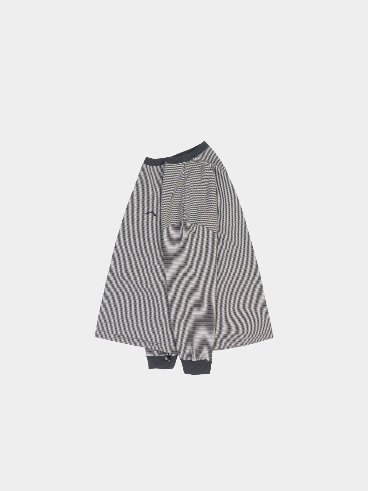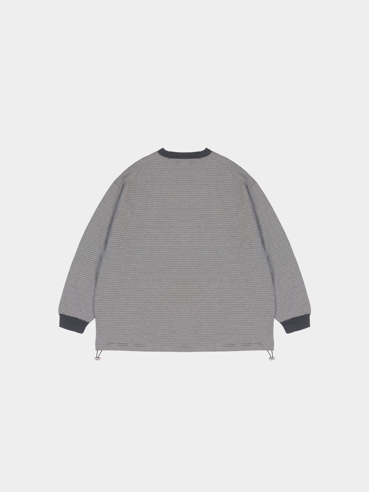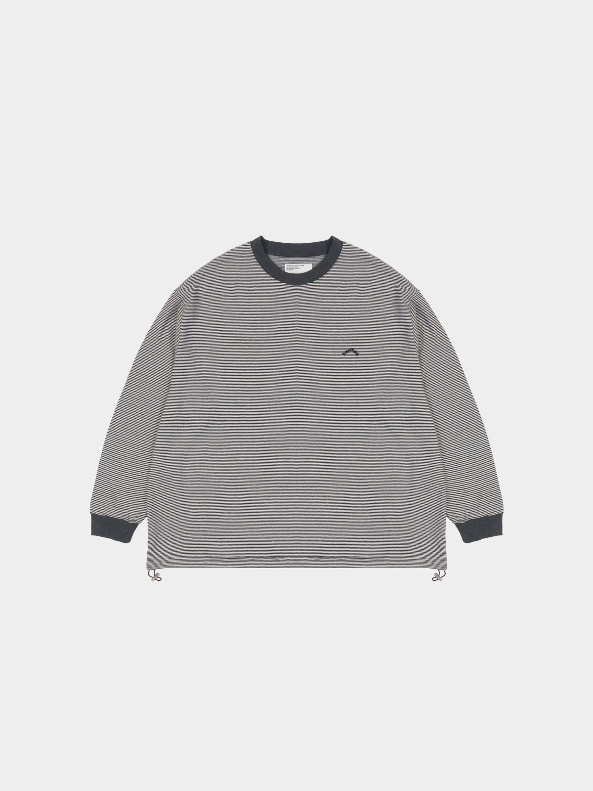 This is a long-sleeve tee with adjustable volume thanks to its string detail. The intersecting two-color stripe pattern adds character to a simple basic tee, allowing you to tighten the hem string for a sculpted silhouette or let it loose for a relaxed fit. The matching ribbed accents and small logo embroidery provide a solid finish. It's a practical choice usable from in-between seasons throughout the year.