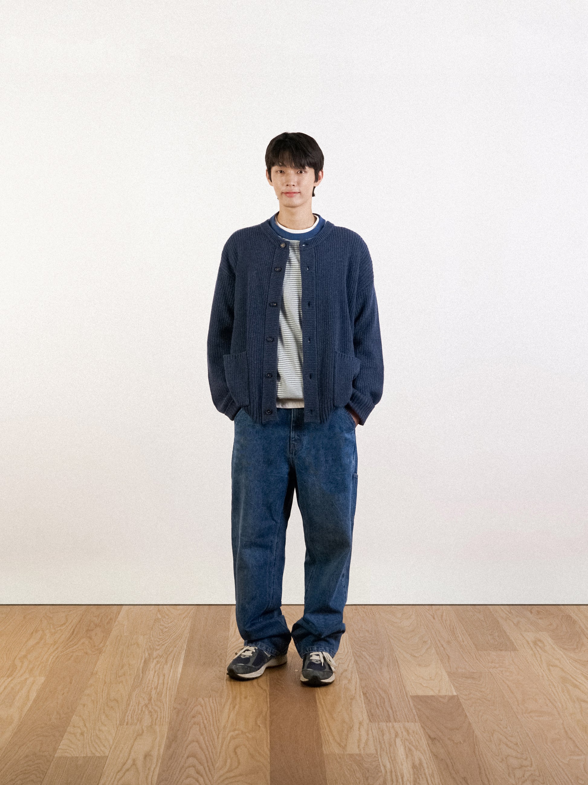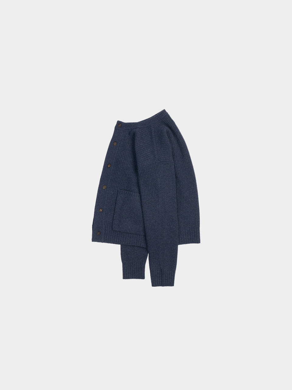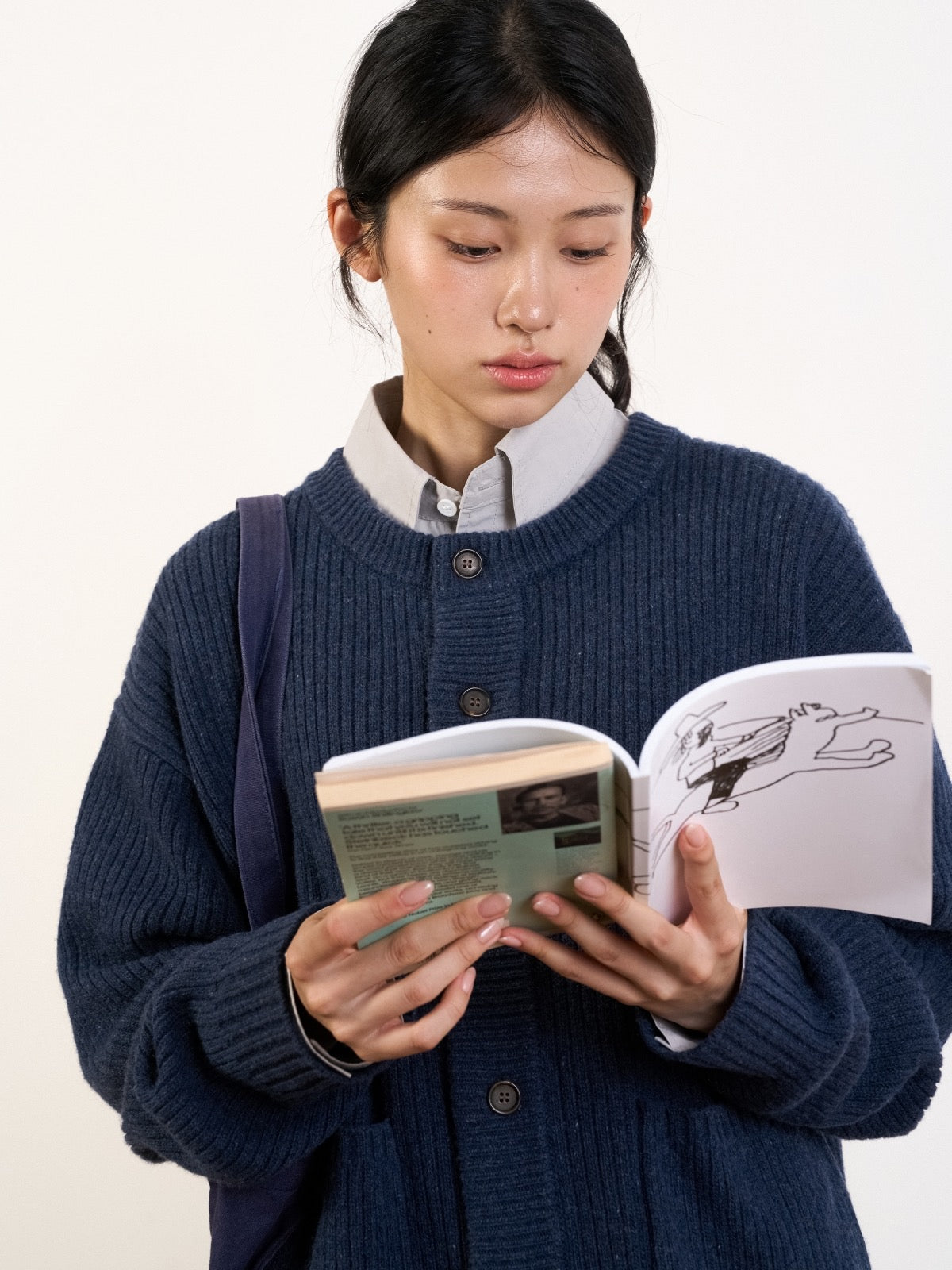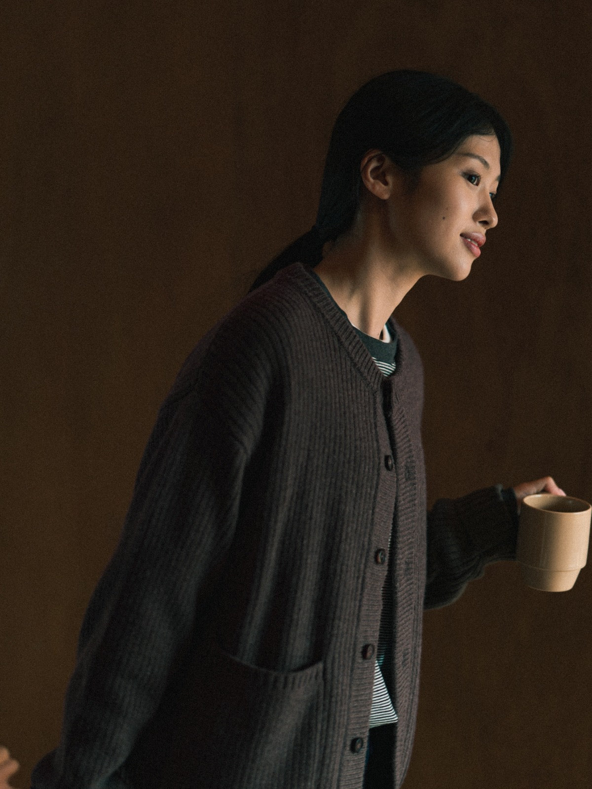 Crafted from a wool blend material, this round-neck cardigan stands out with its textured knit details and soft feel. The gently draping round neckline and relaxed silhouette offer versatility, making it suitable for solo wear or layered styles. The unique elasticity of wool combined with sturdy low-gauge knitting ensures durability and practicality, making it a go-to piece throughout the seasonal boundaries.