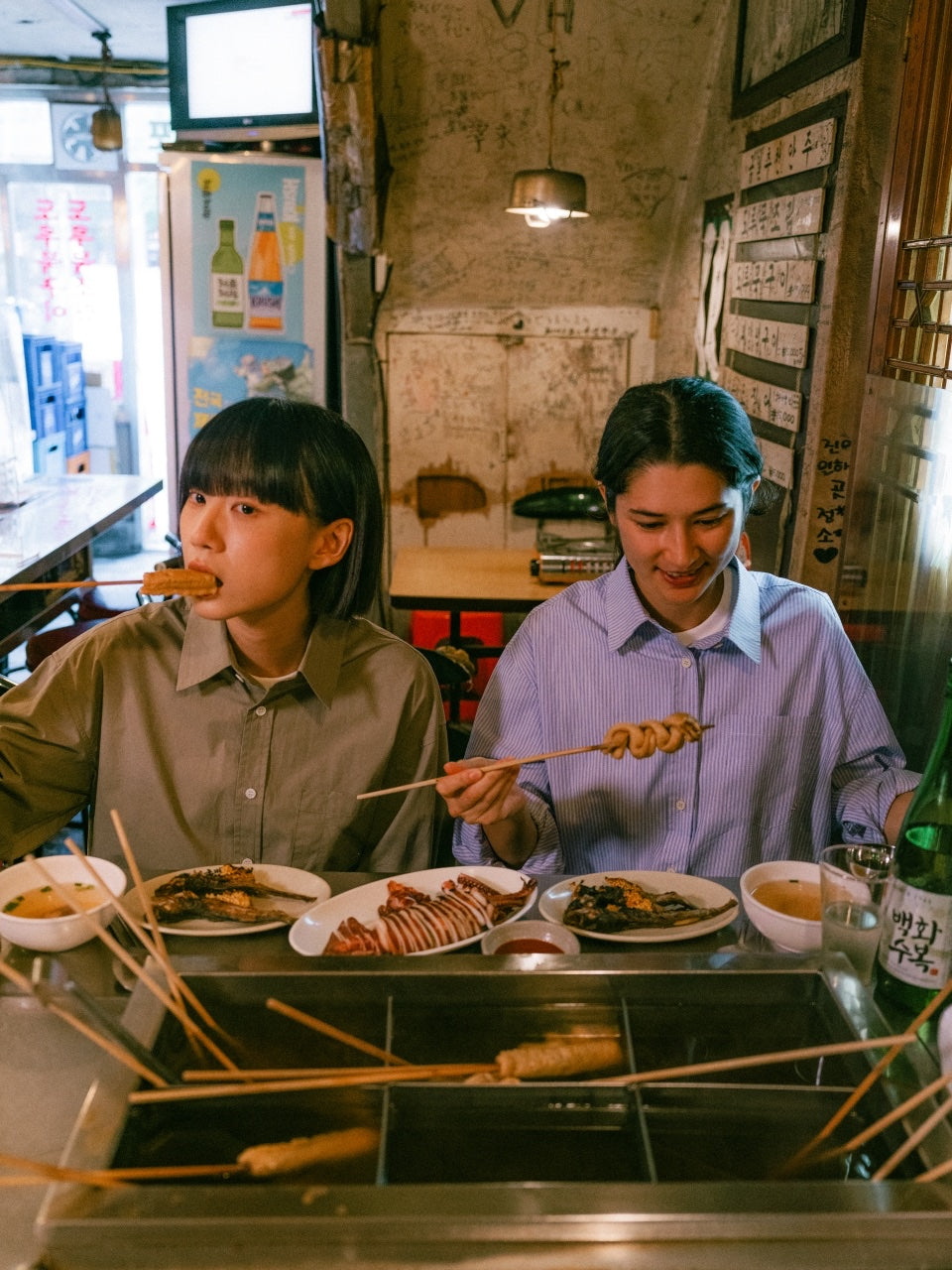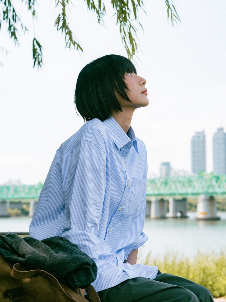 This shirt features a sky-blue double stripe pattern and a relaxed silhouette. It offers a comfortable fit for any body type with its natural shoulder line and cropped length, accented by square pocket detail. Made from high-density cotton fabric with post-processing washing, it's suitable for all seasons and resists deformation after washing. The fine double stitch and the subtle sunshine logo embroidery enhance its refinement.